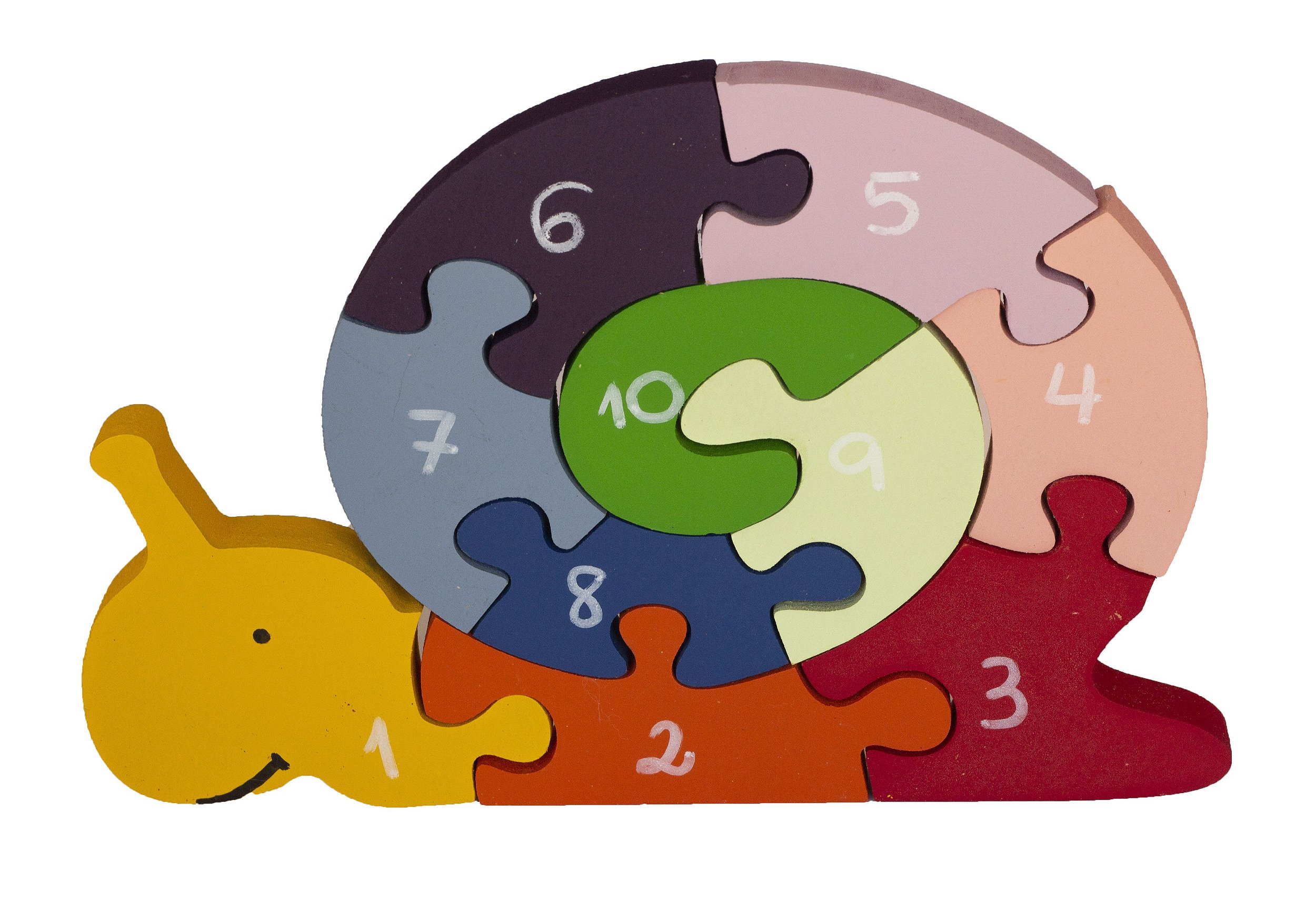 Quebra-cabeça educativo em formato de caracol, com dez peças coloridas enumeradas de 1 a 10. Brinquedo confeccionado artesanalmente em madeira de reflorestamento e pintado com tinta atóxica.